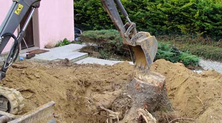 Une fois l’arbre abattu, il reste tout de même une souche qui peut être plus ou moins grande, disgracieuse et embêtante. Il faut habituellement faire enlever cette souche, ce qu’on appelle un dessouchage. Cette étape peut intervenir sous plusieurs aspects. On peut utiliser une rogneuse qui rongera la souche jusqu’au niveau du sol, le reste de la souche se désagrègera naturellement ou à l’aide d’un produit accélérant. La rogneuse doit cependant être tractée et demande donc un accès relativement large et aisé.