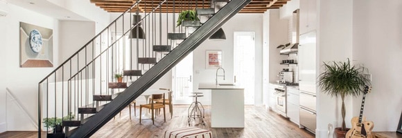 L’escalier quart tournant permet de réduire le volume de la cage d’escalier et changeant l’orientation de l’escalier. Pour y parvenir, on peut soit installer un palier qui servira de redirection, ou d’une section de marches rayonnantes, tournantes. Cet escalier est de loin le plus avantageux, car il permet de réduire l’espace perdu tout en offrant toujours une excellente marge de manœuvre. Notez que si les escaliers quart tournants sont les plus communs, vous pouvez également disposer d’un escalier demi tournant ou tournant. Le prix d’un escalier quart tournant oscille entre 1500€ et 12 000€. Prix d’un escalier suspendu L’escalier suspendu est l’escalier le plus moderne, celui que les designers s’arrachent en ce moment. Il s’agit tout simplement de faire disparaître le limon, ou en tout cas de le réduire à sa plus simple expression. Dans la majorité des cas, l’escalier suspendu propose des marches qui semblent surgir du mur d’échiffre sans aucune aucun élément. Exit les contremarches et autres limons massifs, l’escalier suspendu est aérien et minimaliste. Ses matériaux de prédilection, le métal, le bois et le béton brut rappellent d’ailleurs largement cette modernité. Le prix d’un escalier suspendu s’étale de 8000€ à 15 000€. Prix d’un escalier sur mesure Si vous désirez disposer d’un escalier aux formes audacieuses et aux dimensions atypiques, la seule solution est l’escalier sur mesure. Vous dessinerez votre escalier avec un professionnel qui se chargera ensuite de la fabrication en atelier. L’escalier suivra donc vos dimensions au millimètre et vos indications à la lettre. Le prix d’un escalier sur mesure varie de 750€ à 15 000€. Prix d’un escalier extérieur L’escalier extérieur est idéal pour donner une totale indépendance à un étage, ou pour garantir un bon accès à une terrasse. Vu l’emplacement exposé aux intempéries, on choisit généralement des matériaux très résistants et antidérapants, comme le métal ou le béton. Le prix d’un escalier extérieur oscille de 600€ à 12 000€.